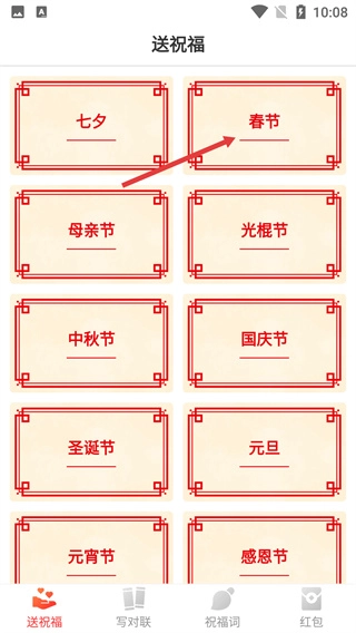 1、进入【送祝福】页面,该页面展示七夕、春节等多个节日选项,点击【春节】选项,进入春节对应的祝福语界面。