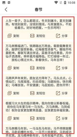 2、进入【春节】祝福语页面,可看到多条不同风格的春节祝福内容,每条祝福下方配有复制、发短信、分享等操作按钮。