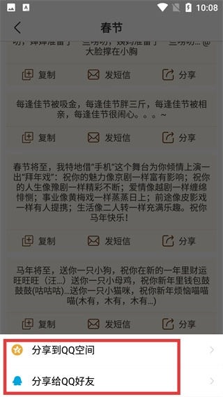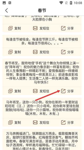 3、在春节祝福语页面,选定目标祝福语后,点击该祝福语下方的【分享】按钮,弹出分享渠道的选择窗口。