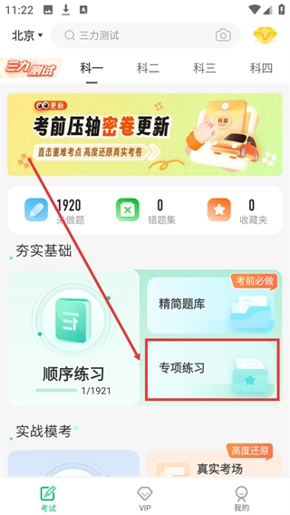 1、进入【科一】页面后,点击【专项练习】模块,即可进入科目一专项练习页面。