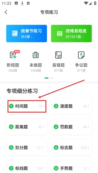 2、进入【专项练习】页面后,点击【时间题】选项,即可针对科目一的时间类题目进行练习。