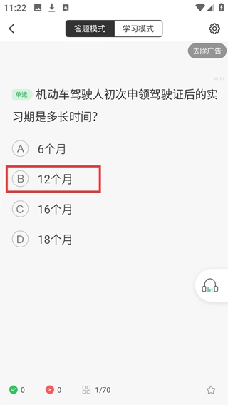 3、进入【时间题】的答题页面后,当前处于【答题模式】,需要回答“初次申领驾驶证的实习期时长”这道单选题,选择【12个月】即可完成该题作答。