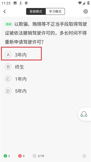 4、继续进行【时间题】的作答,当前的题目为“通过不正当手段获取驾驶证被撤销后,多长时间内不得重新申请”,请选择【3年内】这一选项来完成本题,以此积累答题进度。