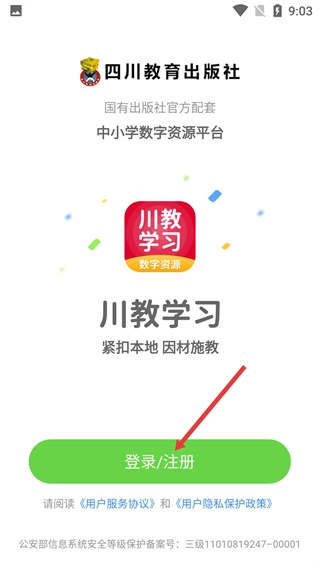 1、打开【川教学习】应用,点击页面上的【登录/注册】按钮,即可进入登录界面。