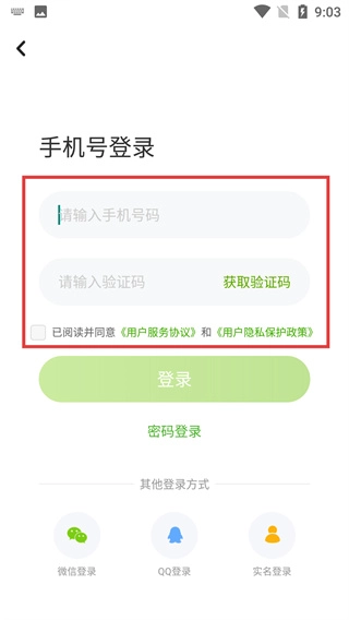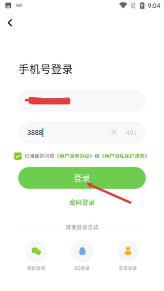 3、进入【手机号登录】界面后,填写好手机号和验证码,勾选相关协议,再点击绿色的【登录】按钮。