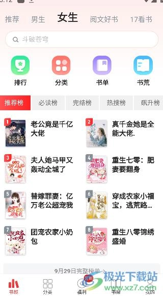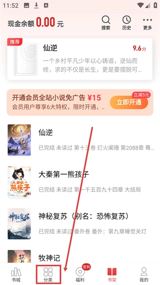 1、进入书架页面,点击底部【分类】选项,可进入小说分类页面,该页面包含不同类别的小说资源入口。