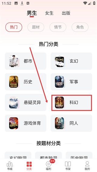 2、进入分类页面,在【热门分类】中点击【科幻】选项,可进入科幻类小说列表页面,查看该类别下的小说作品。