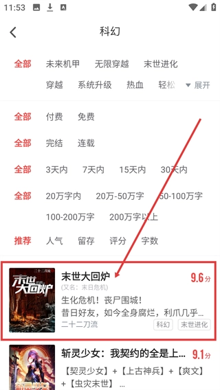 3、进入科幻类小说列表,可看到【末世大回炉】等作品,该小说评分【9.6分】。