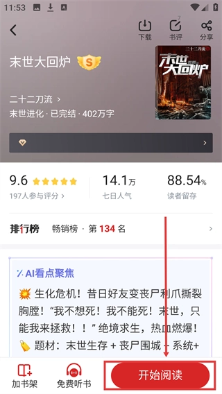 4、进入【末世大回炉】详情页,点击底部【开始阅读】按钮,即可进入该小说的阅读界面,还能选择加书架或听书。