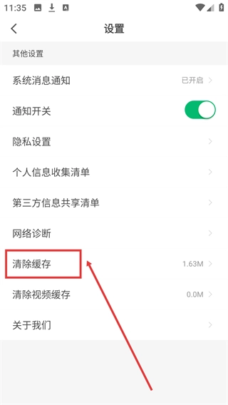 3、进入【设置】页面,点击【清除缓存】选项,可处理应用缓存数据。