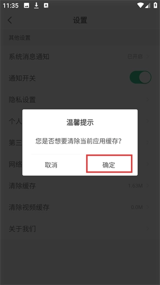 4、点击【清除缓存】后,会弹出【温馨提示】弹窗,选择【确定】按钮即可完成缓存清除操作。