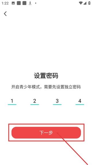 4、在【设置密码】页面,输入4位独立密码后,点击【下一步】按钮,可继续完成青少年模式的开启配置。