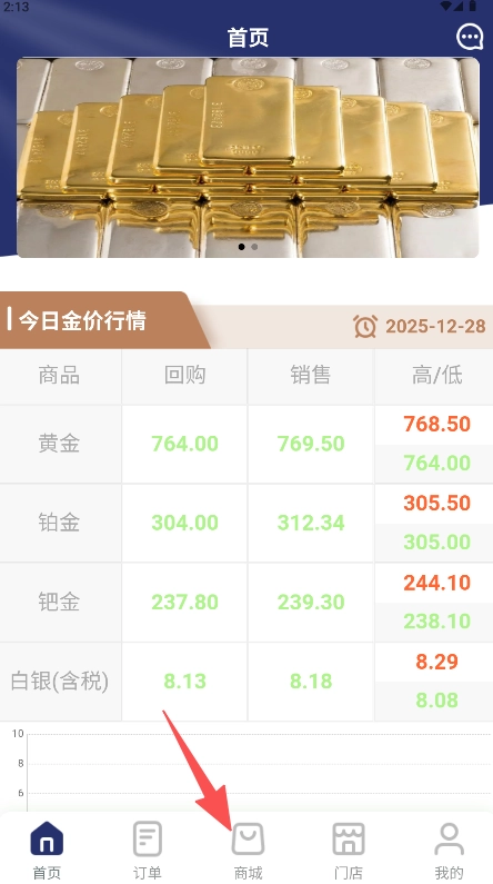 2、首页设计需重点凸显贵金属价格行情,在醒目位置呈现黄金、铂金当日的实时回购价格以及销售参考价格。