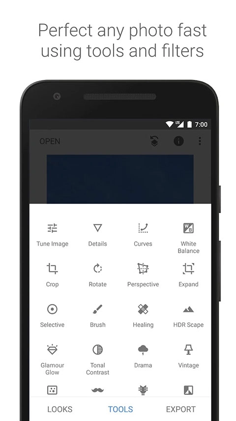 snapseed手机修图软件免费版是一款在全球广受欢迎的专业级修图编辑工具,免费使用各种工具,修图、编辑、滤镜、剪裁、旋转、变形、画笔、局部调整、修复、文字、镜头模糊、魅力光晕、色调对比度、HDR景观、戏剧效果、斑驳、颗粒胶片、复古胶片、美颜处理等,满足用户各种美图修图需求。