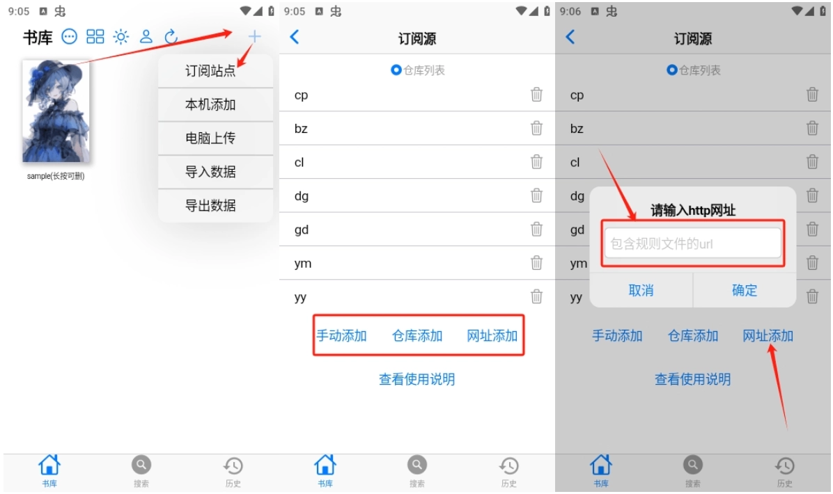 2、支持通过多种途径添加书源,包括本地导入、仓库获取及直接输入网址,自由度极高。