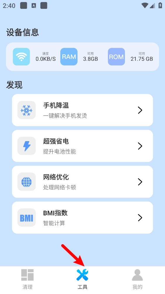 2、进入主页涵盖多个板块的应用清理。