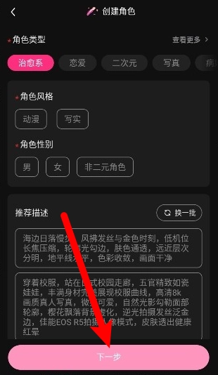 5、进入后选择角色的类型、风格与性别,输入描述内容,然后点击“下一步”,按照提示完成角色创建。