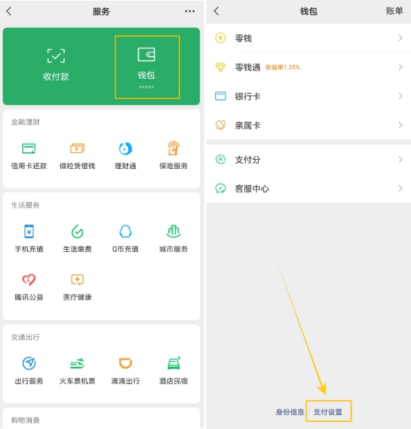 2、打开「钱包」→点击位于底部的「支付设置」;