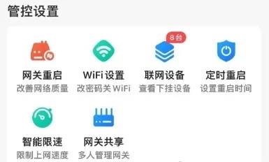 点击网络,网关设置,重启网关,即可重启,但网络需要1分钟恢复,重启后可能需要手动连接WiFi