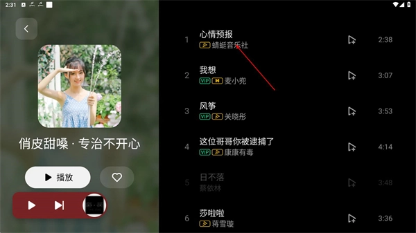 2、进入目标歌单页面后,选中歌单里的任意一首歌曲并点击,即可跳转至该歌曲所属的歌单列表页面。