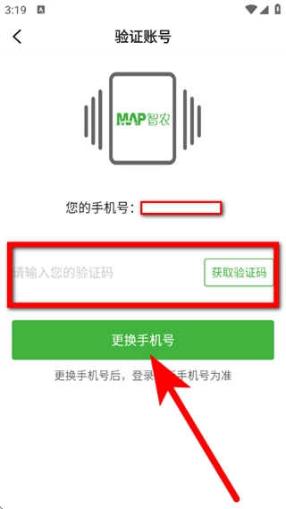 5、在验证账号页面,输入验证码,点击更换手机号,完成手机号修改。
