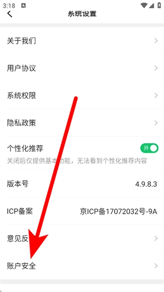 3、在系统设置页面,点击账户安全选项,进入账户安全页面。