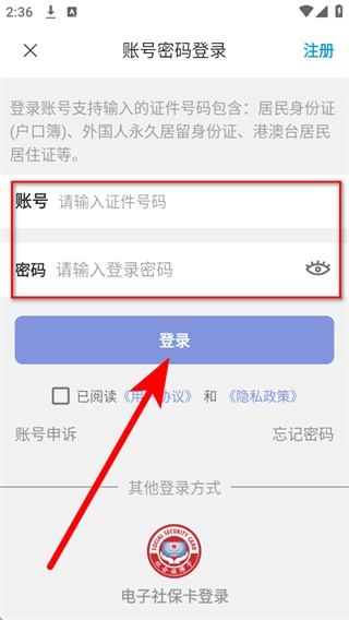 4、进入账号密码登录页面后,依次填写账号与密码信息,勾选所需的相关协议,最后点击登录按钮即可完成登录操作。
