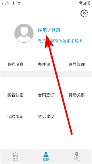 3、在个人中心页面找到注册登录区域并点击,即可进入账号登录界面。