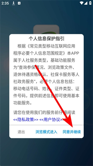 1、启动云南人社12333App,在页面上点击同意并继续,进入应用的主界面。