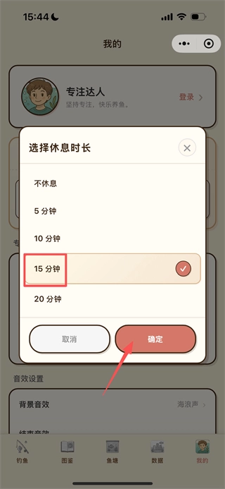 3、在休息时长的弹窗里,选定想要的时长后点击确定按钮,就能完成休息时长的设置了。