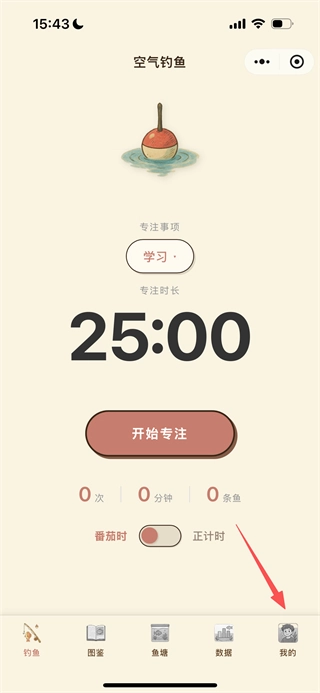进入空气钓鱼后,点击底部的“我的”选项,即可进入个人中心页面。