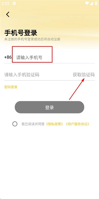 2、在登录页面输入手机号,勾选相关协议后,点击“获取验证码”按钮。