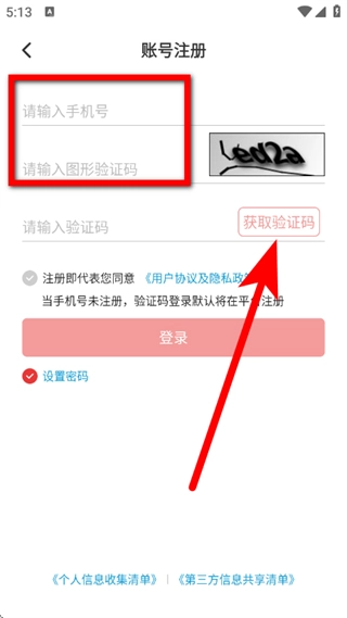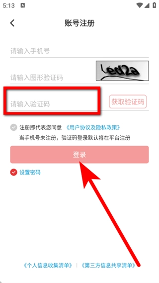 4、在输入框中填写验证码,勾选相关选项后设置密码,再点击登录按钮,即可完成账号注册流程。