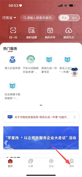1、在豫事办首页,点击底部的我的选项,进入登录页面。