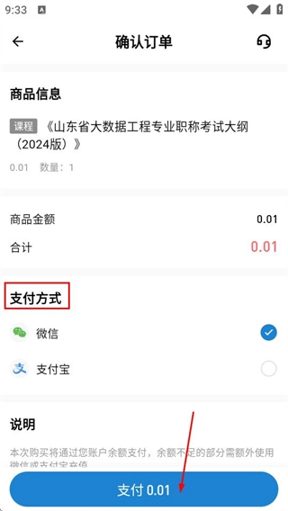 在确认订单的页面,选好支付方式并点击支付按钮,就能完成课程的购买。