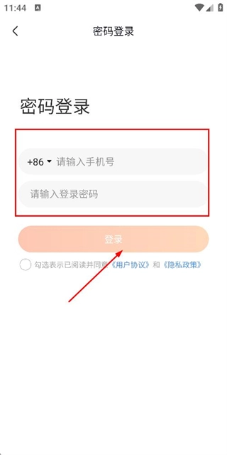 3、在登录页面填写手机号和密码,勾选协议后,点击登录完成账号登录操作。