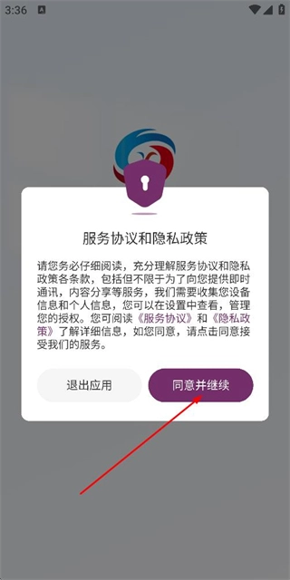 1、在使用协议与隐私政策弹窗中点击“同意并继续”,即可进入登录页面。