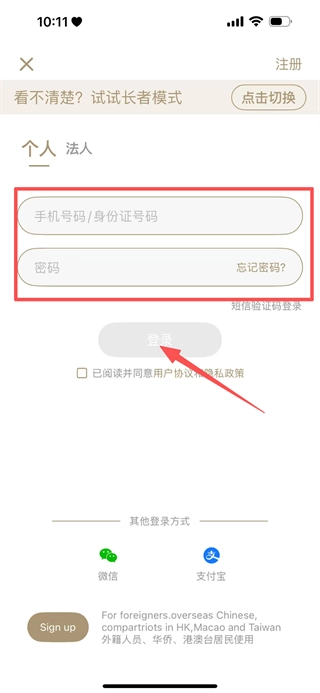 3、进入登录页面后,填写手机号码或身份证号以及密码,接着点击登录按钮,即可完成登录操作。