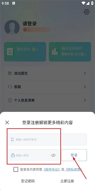 3、在登录界面输入手机号与密码,勾选相关协议后点击登录按钮,即可完成登录流程。