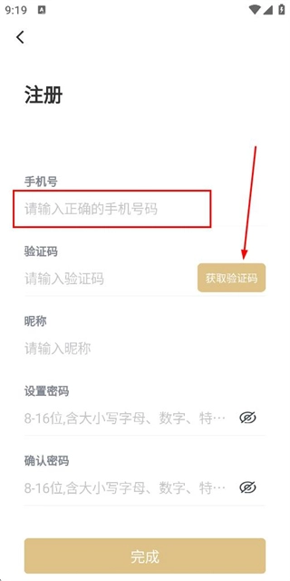 3、在注册账号页面填写验证码、昵称和密码,点击注册完成注册操作。
