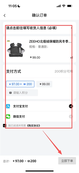 5、进入确认订单页面后,需填写收货信息、选择支付方式并勾选相关协议,之后点击“立即下单”按钮,即可完成购买流程。