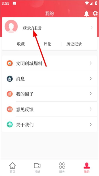 2、在个人中心页面,点击登录注册区域,即可进入登录页面。