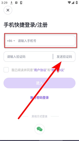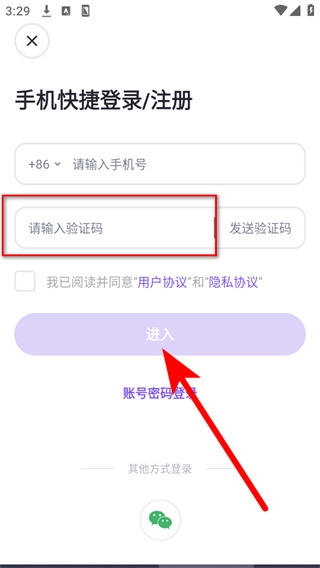4、将收到的短信验证码填入验证码栏,勾选相关协议后,点击进入,即可完成登录。
