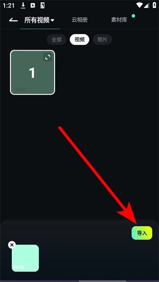 2、进入素材界面后切换至视频标签页,选中需要进行编辑的视频素材,随后点击导入按钮。