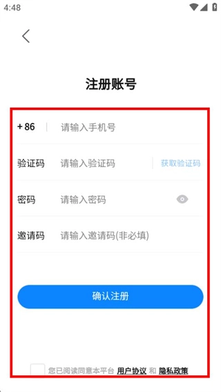 4、进入注册页面后,填写相关信息并勾选协议,随后点击确认注册按钮,就能完成账号注册流程。