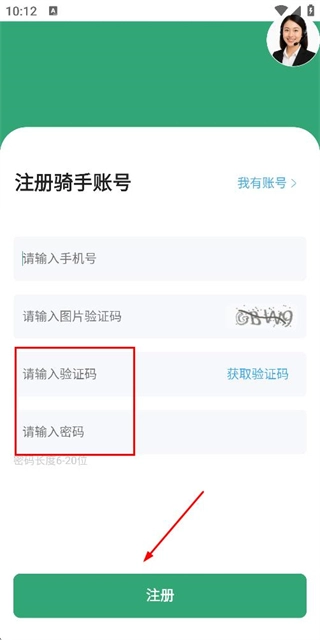 3、在注册账号页面填写验证码和密码,点击注册完成注册操作。