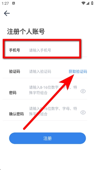 4、在注册个人账号页面,输入手机号,点击获取验证码。