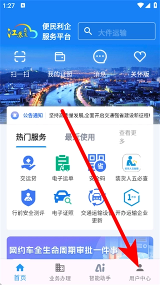 1、在江苏交通云页面,点击底部用户中心,进入用户中心页面。