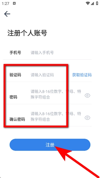 5、在输入框,输入验证码,设置密码,点击注册,完成个人账号注册。