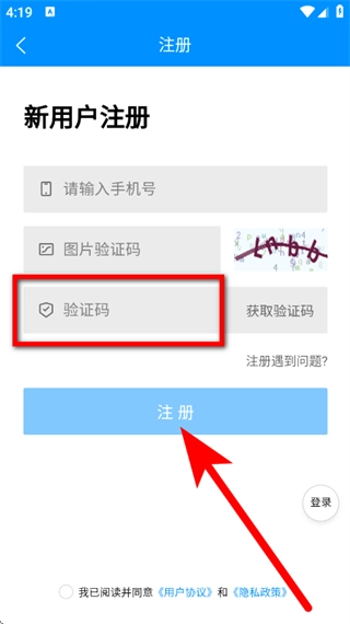 6、在输入框,输入验证码,勾选相关协议后,点击注册,完成新用户注册。